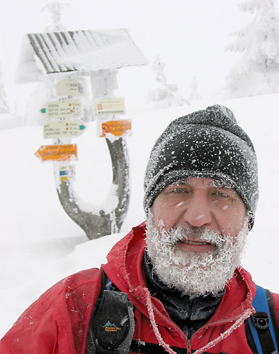 Za těchto podmínek jsme udělali dvě věci: nabalili se jako pumpy a změnili trasu. Místo nástupu ze Skřítku a celodenního pochodu (za takových podmínek se určitě běžet nedalo) po otevřeném hřebenu proti mrazivému větru, který by zvolil jen hazardér, jsme vyrazili z Červenohorského sedla na Praděd z opačného směru. Vítr zde foukal rozumně a do zad, takže i mráz byl celkem snesitelná.