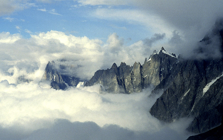 Jako třeba teď, když se na okamžik v dálce vynořily z mlh tyto stěny (Aiguiles nad Chamonix).