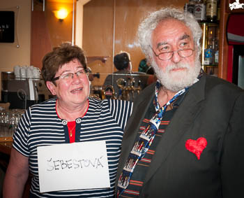 | Na závěr bylo předáno ještě několi darů, které se obzvláště vydařily. U jednoho jsem však narazil. Objekty na snímku představují zapeklitý gramatický problém. Nejsou to ani dva hajzli, ani dva hajzly či dokonce dva hajzlové. Únikovou variantu dva hajzlíci jsem zavrhnul ihned jako hrubé bagatelizování skutečnosti. Naštěstí čeština je jazyk bohatý a vazbou "Na obrázku vidíme dvé hajzlů" problém elegantně řeší. Tím bylo holdování oslavenci náležitě zakončeno a mohlo se přistoupit k volné veselici. ![]() Nastoupili WK posílení o mladou krev. Nevím, zda to bylo tím, ale krev se rozproudila i v ostatních, zejména v některých, jak to ostatně má být. Dokonce i Přema se vrhl či snad byl stržen do víru tance, nedbaje o svůj požehnaný věk, o jiných atributech ani nemluvě. | ![]() Na závěr dovolte malou vsuvku ohledně sebestřednosti oslavence, kterého se tímto musím zastat. Kdysi lidé věřili, že středem všeho je Země. Koperník to trochu posunul - a že prý Slunce. Giordano Bruno si myslel, že ne, že sluncí je mnoho, toho ale upálili a Slunce bylo zase první. Pak se ale objevila Mléčná dráha a střed Vesmíru se nám vzdálil o nějakých třicet tisíc světelných let. Na to jistý pan Hubble zjistil, že galaxií je mnoho, ale opravdu, opravdu mnoho. A přišel na to, že vše začalo velkým třeskem, kdy z fakt nepatrného bodu vzniklo vše. Kde se tento bod nachází se ale podařilo zjistit až skutečně nedávno, a to tak, že všude. Lze tedy s klidným svědomím říci, že svým způsobem oslavenec je středem Vesmíru a jeho sebestřednost má hluboké vědecké pozadí. Nemůže jít o plytkou pomluvu, neboť toto jest pravdou. Oslavenec